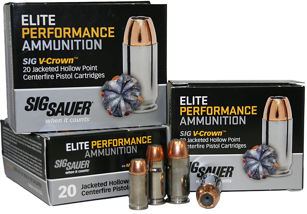 V-Crown Jacketed Hollow Point bullets are designed to provide superior accuracy, reliability, and performance in a personal defense round. The Sig V-Crown stacked hollow point design provides a smaller, additional hollow point cavity behind the main cavity. This design, along with V-shaped jacket skives and scores, provides controlled, uniform expansion at all effective distances and velocities. The bullet has a unique toothed cannelure halfway up the shank to more effectively lock the jacket and core which provides exceptional structural integrity in a jacketed design, ensuring maximum weight retention and outstanding terminal performance. Brass cases are coated with Ducta-Bright 7A for enhanced lubricity, superior corrosion resistance, and reliable feeding and extraction. Each caliber loading of Sig Sauer Elite Performance Ammunition is precisely matched to the core temper of its Sig V-Crown bullet to ensure maximum terminal performance.