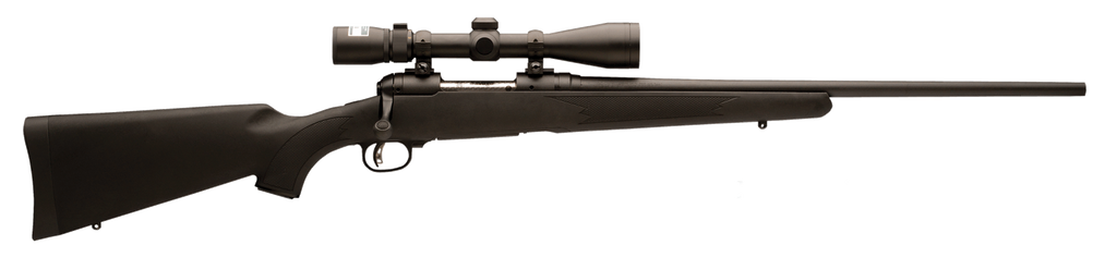This Savage 11/111 Trophy Hunter XP bolt action rifle features a synthetic black stock and comes with a mounted and boresighted Nikon 3-9x40 BDC reticle scope. It also features an AccuTrigger, detachable box magazine, and a matte black carbon steel barrel.
