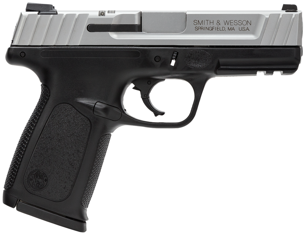 The SD VE features an SDT (Self Defense Trigger) for optimal, consistent pull first round to last. The polymer grip frame has a slim, ergonomic, textured grip; textured finger locator; aggressive front and backstrap texturing; and Picatinny-style front rail. The stainless steel slide features front and rear serrations and is fitted with 3-dot white sights. This two tone model has a black frame with a satin finish stainless steel slide.