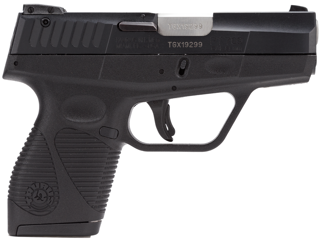 The Taurus 709 Slim is a compact 9mm pistol perfect for concealed carry. The 19 oz pistol is less than an inch thick and features Taurus' unique SA/DA trigger system. The Taurus 709 Slim also features fixed sights, a visual loaded chamber indicator, and the unique Taurus Security System.