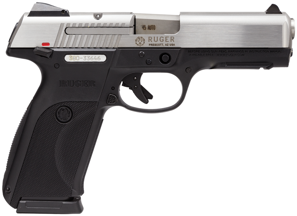 The Ruger SR45 is perfectly sized to be comfortable and controllable with a slim ergonomic grip and narrow slide. The high-visibility 3-dot sight system features a raked-forward front sight for easy removal from the holster, and the rear sight is adjustable for windage and elevation. The SR45 also features a reversible backstrap (flat or arched), an ambidextrous thumb safety, a D-shaped magazine release, an integral accessory mounting rail, and a patented loaded chamber indicator. Each pistol ships with two 10-round, flush-fit magazines.