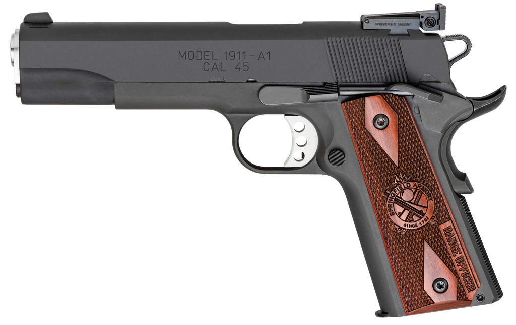 For shooters who need a competition 1911, the Range Officer 45 ACP from Springfield Armory offers finely tuned performance without breaking the bank. It brings the precision of a competition pistol in a simple and straightforward configuration. This Range Officer has the same quality forged national match frame and slide as the Trophy Match and TRP 1911s, with the same precision fit. Add in the same national match stainless steel barrel and bushing, and you have a pistol that shoots well beyond its price tag. The Range Officer is topped with a fiber optic front sight and fully-adjustable rear target sight for maximum flexibility. This competition-grade pistol features a 5" stainless steel, match-grade barrel and a GI style recoil system. The beavertail grip safety, extended lightweight trigger and flat mainspring housing allow the pistol to sit in your hand comfortably for long periods of time at the range. It has a Parkerized forged carbon steel frame and slide. It is finished with double diamond cocobolo grips and includes two 7-round blued steel magazines. It all adds up to a pistol that will let you seriously compete in a variety of matches.
