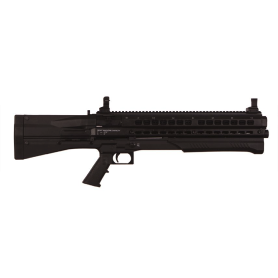 The UTS-15 is a unique pump-action shotgun of only 28.5" overall length, for quick pointing functionality in the woods or for protection at home. It has dual 7-round magazines with automatic alternating or selectable feed, snap open loading ports and retractable magazine followers. It is able to fire 2.5", 2.75", or 3" magnum ammunition. The UTS-15 also features a positive bolt lock that locks the action closed when engaged. The bolt release button is under the rear of the stock, well away from the trigger. It has a Picatinny top rail. The fiber-reinforced butt plate has a 1", 8 durometer (A scale) energy absorbing recoil pad. The UTS-15 has a 4140 steel barrel threaded to accept Beretta-style chokes, and is supplied with an extended cylinder choke tube.